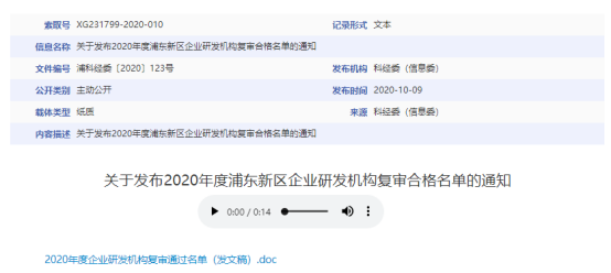 According to the requirements outlined in the "Administrative Measures for the Recognition and Management of R&D Institutions in Pudong New Area" (Pudong Science and Technology Commission [2019] No. 1) regarding the review, the R&D institutions of companies in Pudong New Area that were recognized before December 31, 2019, underwent a review for the year 2020. After evaluation by the Pudong Science and Technology Commission, the company has successfully passed the 2020 R&D institution review.