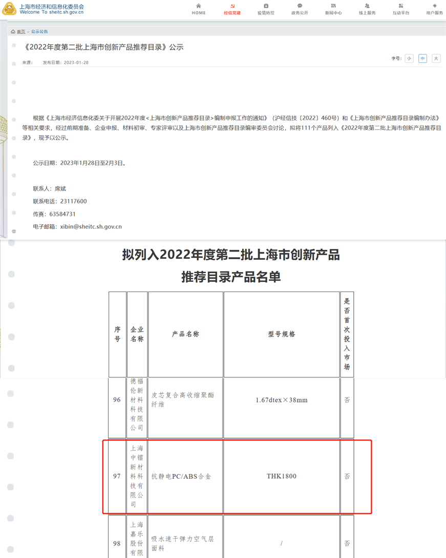 According to the Notice of Shanghai Economic Information Technology Commission on the Preparation and Declaration of the 2022 Annual <Shanghai Innovative Products Recommended Catalogue> (Shanghai Economic Information Technology [2022] No. 460) and the "Shanghai Innovative Products Recommended Catalogue Preparation Method" and other related requirements, the companys antistatic PC/ABS alloy was included in the "Shanghai Innovative Products Recommended Catalogue" after evaluation.