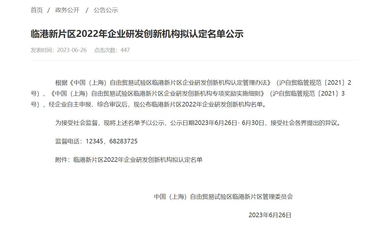 根據(jù)《中國(上海)自由貿(mào)易試驗區(qū)臨港新片區(qū)企業(yè)研發(fā)創(chuàng)新機構(gòu)認定管理辦法》(滬自貿(mào)臨管規(guī)范〔2021〕2 號)、《中國(上海)自由貿(mào)易試驗區(qū)臨港新片區(qū)企業(yè)研發(fā)創(chuàng)新機構(gòu)專項獎勵實施細則》(滬自貿(mào)臨管規(guī)范〔2021〕3號),公司獲評臨港新片區(qū)企業(yè)研發(fā)創(chuàng)新機構(gòu)。