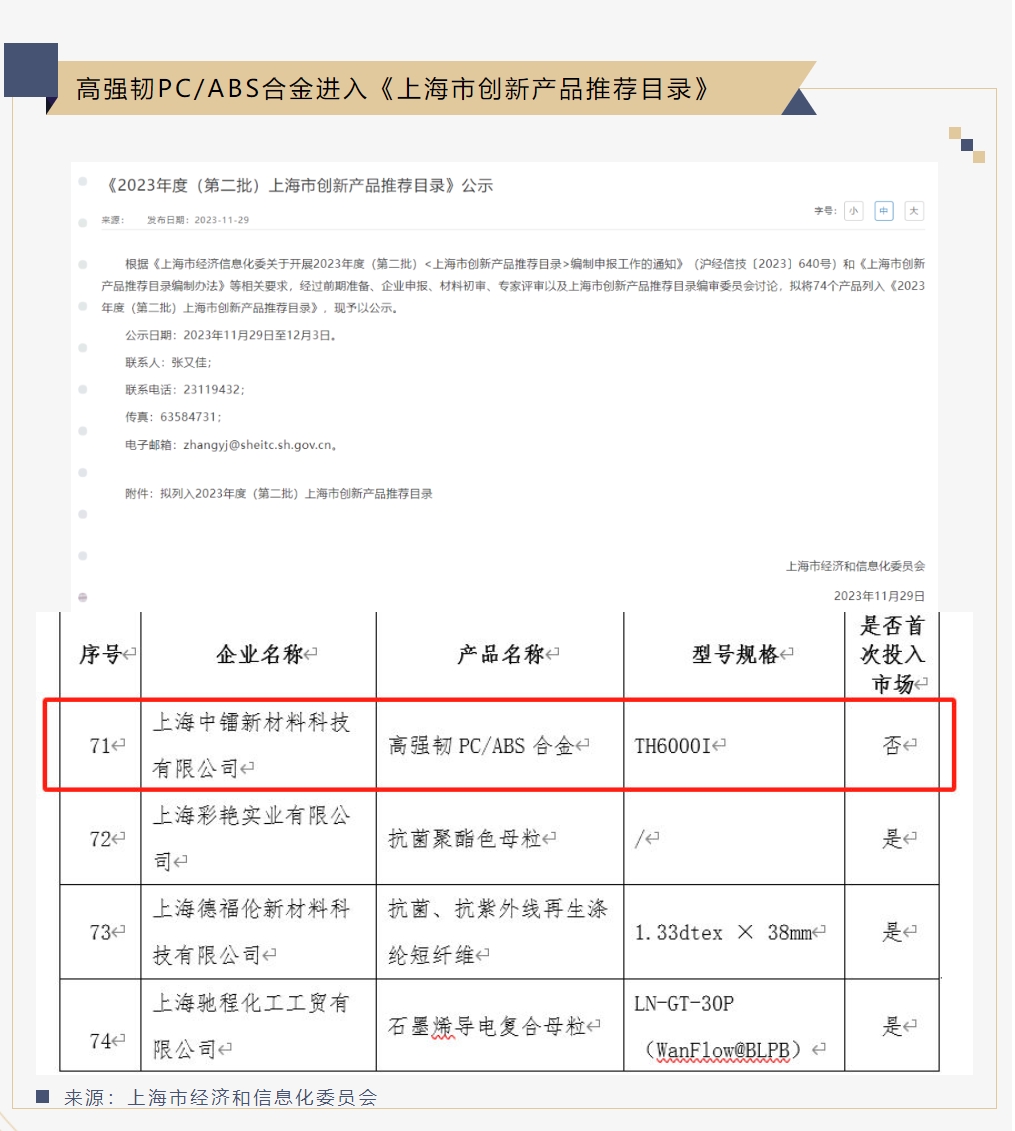 根據(jù)《上海市經(jīng)濟(jì)信息化委關(guān)于開(kāi)展2023年度(第二批)<上海市創(chuàng)新產(chǎn)品推薦目錄>編制申報(bào)工作的通知》(滬經(jīng)信技〔2023〕640號(hào))和《上海市創(chuàng)新產(chǎn)品推薦目錄編制辦法》等相關(guān)要求,經(jīng)評(píng)審,公司高強(qiáng)韌PC/ABS合金進(jìn)入《上海市創(chuàng)新產(chǎn)品推薦目錄》。